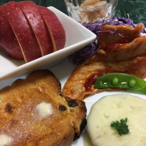 365日クッキング 1月13日の朝ごはん(さつまいものチーズがけとポークチャップ) レーズンバタートースト、さつまいものチーズがけとエンドウ、ポークチャップと紫キャベツの千切り、白花豆の甘煮、りんご。 【365日cookin...