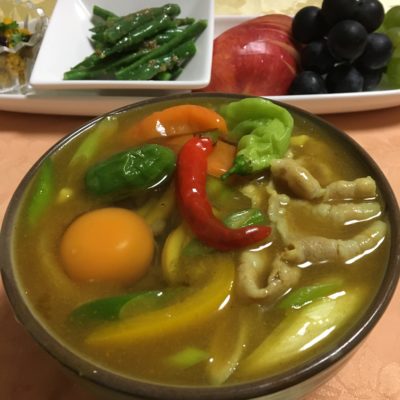 色々唐辛子入りのカレーうどん、パンプキンサラダ、インゲンの胡麻和え、りんごと巨峰にマスカット。