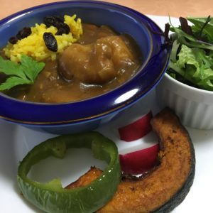 ポークチャップと野菜サラダ、ヨーグルトとプルーン、キウイフルーツ。
