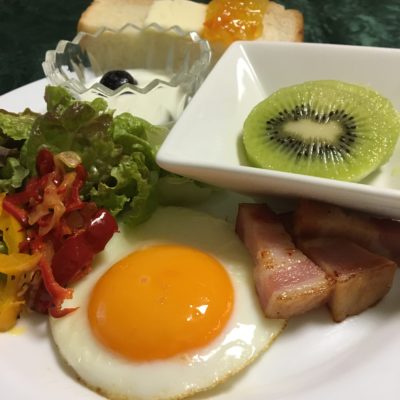 目玉焼きとベーコンソテー、レタスとピーマンのソテー、ヨーグルトと冷凍ブルーベリー、キウイフルーツ。
