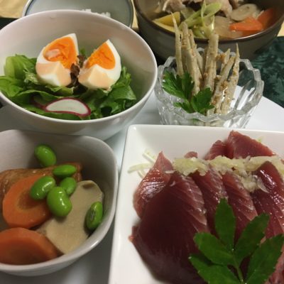 365日クッキング 10月16日の晩ごはん 2023年3月15日 鮪の塩焼きとプチトマト、根菜のそぼろがけ、レタスとポテトサラダ。 【365日cooking】調理時間30分以内がサブコンセプトコロナ禍以来、家族そろって在宅work。低いハードルで毎日普通のごはんを作る 2021年10月16日の晩ごはん じゃこ天と海老の塩焼きに菊のお浸しと大根おろし、プチトマト、小松菜の肉味噌がけ、玉子とアボカドのサラダ。 2020年10月16日の晩ごはん 豚汁、鰹のお刺身、煮物、ごぼうの胡麻和え、レタスとタマゴのサラダ。