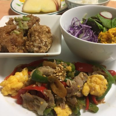365日クッキング 11月1日の晩ごはん 2023年3月20日 とんかつと揚げ野菜、キャベツの千切り。 【365日cooking】調理時間30分以内がサブコンセプトコロナ禍以来、家族そろって在宅work。低いハードルで毎日普通のごはんを作る 2021年11月1日の晩ごはん 焼肉とピーマンのソテーにレタス、コーンと豆腐のネギ炒め、キムチ納豆。 2020年11月1日の晩ごはん ピーマンと卵の中華炒め、油淋鶏、パンプキンサラダと紫キャベツの千切りサラダ。