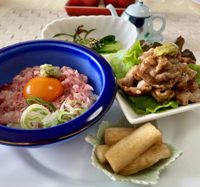 365日クッキング 3月8日のお昼ごはん(ネギトロ丼と豚の生姜焼き) タタキマグロごはん、焼しゃぶサラダ、大根のお漬物、小松菜のお浸し。 お茶菓子はフルーツバー半分。 ポモロジーのホワイトフィグ。 【365日c...