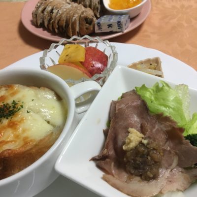 ローストビーフとレタスにブロッコリー、オニオングラタンスープ、もやしの酢の物、りんごと柿。