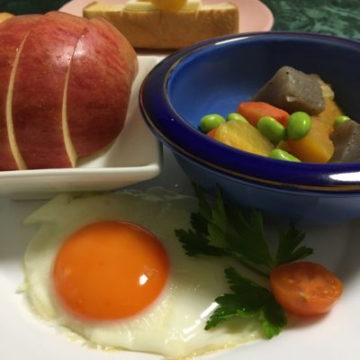 目玉焼きサニーサイドアップとプチトマト、根菜とこんにゃくの煮物、りんご。