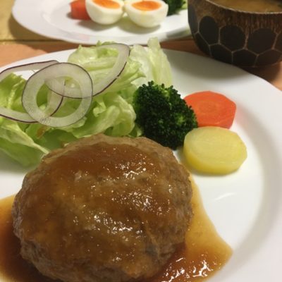 和風おろしハンバーグ、ボイル人参とブロッコリー、レタスとオニオンスライス。