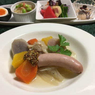 ポトフ、大福豆と小豆の甘煮、小松菜のお浸し、ビーツのサラダと紅大根のピクルス、もやしとカニカマの甘酢和え、塩たまご。