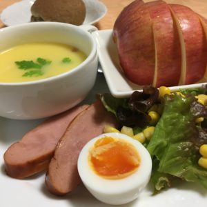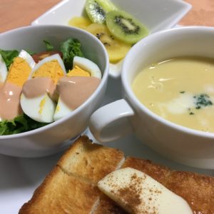 バタートースト、玉子サラダ、コーンスープ、キウイフルーツ。