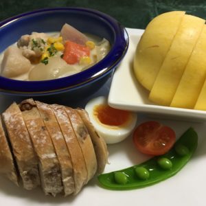 オムレツとレタスにブロッコリー、ポテトサラダとトマト、コーンスープ、ヨーグルトとプルーン。