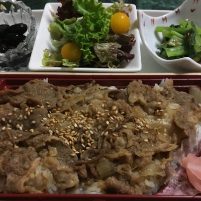 オムレツとリーフサラダ、おでん風の煮物、ヨーグルトと冷凍ブルーベリー。