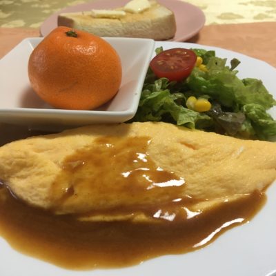 オムレツと野菜サラダ、みかん。