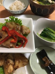 鰤の照焼に大根おろし、豚バラ赤ピーマン炒め、小松菜のお浸し、昆布巻き。