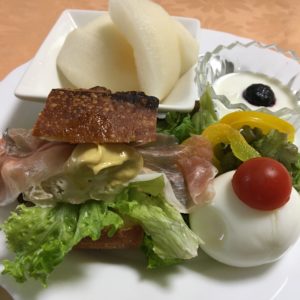ワラサのバルサミコソースと赤ピーマンのソテー、レタスと栗のサラダに塩たまご、自家製のぬか漬け胡瓜、ぶどう。