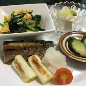 だし巻き卵と野菜サラダ、ブロッコリーと南瓜の甘煮、小松菜のツナ炒め、キムチ納豆。