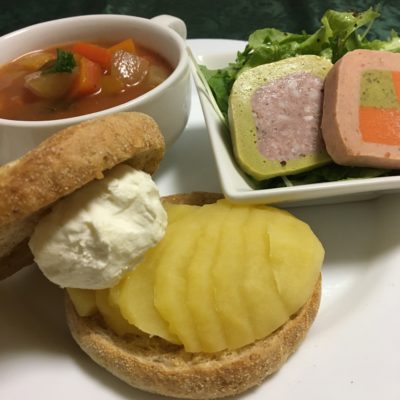 イングリッシュマフィンのりんごサンド、ミネストローネスープ、テリーヌとリーフサラダ。