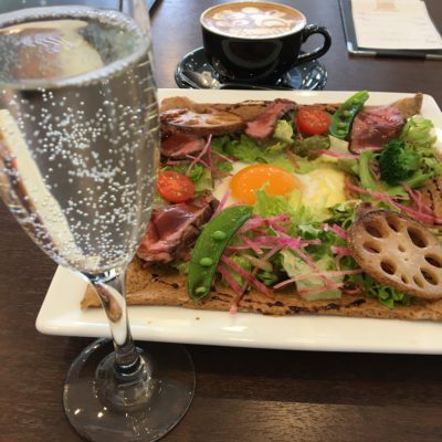 蓮根とローストビーフのガレット、生シードル、カフェラテ。