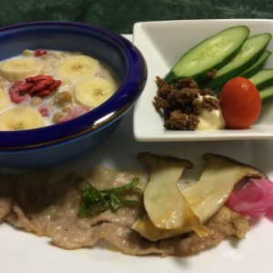 鯖の西京味噌焼と小松菜のお浸し、煮物、焼きナスとトマトのトルコサラダ、キムチ納豆。