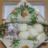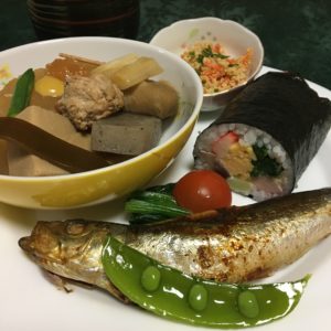 おむすび、鶏の唐揚げ、根菜の煮物。