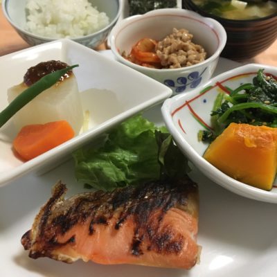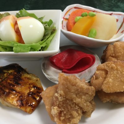 鶏の唐揚げ、鯖の西京味噌焼、根菜の煮物、紅大根のピクルス、ゆで玉子のサラダ。