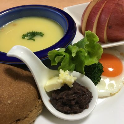 目玉焼きにレタスとブロッコリー、餡バター、コーンポタージュ、りんご。