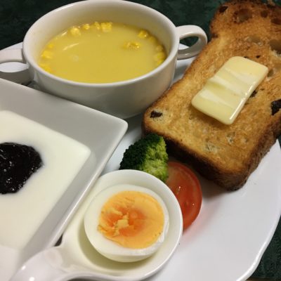 塩玉子にブロッコリーとトマト、コーンポタージュ、ヨーグルトにプルーン。