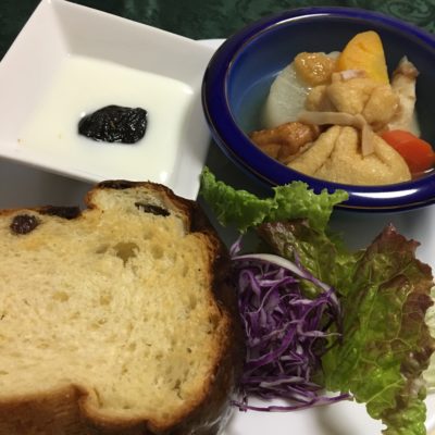 おでんに生姜味噌、紫キャベツとレタス、ヨーグルトとプルーン。