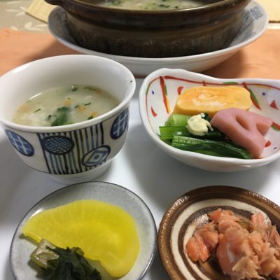 七草のお茶漬け、沢庵と野沢菜のお漬物、鮭のほぐし身、玉子焼きと小松菜のお浸しに蓮根のピクルス。