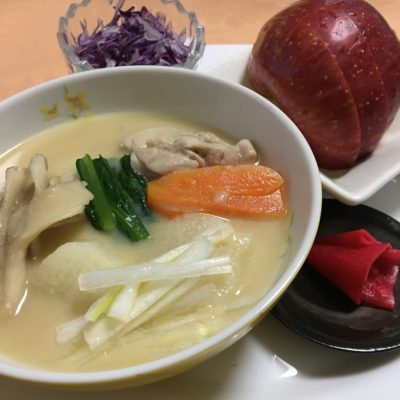 お雑煮、紅大根のピクルス、紫キャベツのサラダ、りんご。