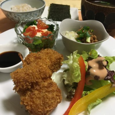 ねぎの肉巻きフライ、パプリカとレタスのサラダ、冷や奴に小松菜とトマト、玉葱納豆。