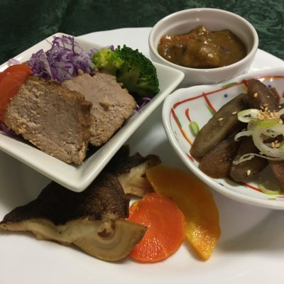 焼き豚サラダ、カレー、素揚げ野菜、ごぼう煮。