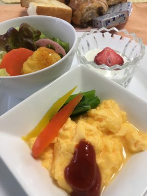 スクランブルエッグにパプリカと小松菜のお浸し、チキンナゲットとサラダ、ヨーグルトと冷凍いちご。