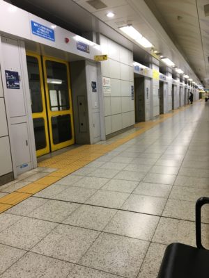 着脱式泥水三連型駅シールド工法で施工され、相対式ホーム2面2線を有する地下駅。ホームドアはフルスクリーンタイプ。珍しい駅を見学した後に外食である。