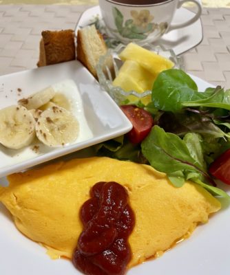 365日クッキング 4月28日の朝ごはん(厚切りのスモークサーモン、海鮮ときのこのアヒージョ) オムライス、リーフサラダ、プチトマト、ヨーグルトとバナナ、パイナップル。 【365日cooking】調理時間は30分以内がサブコンセプトコロ...