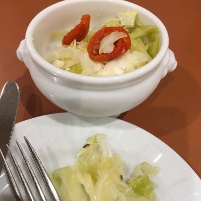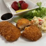 蟹クリームコロッケ、ポテトサラダと小松菜レタスにブロッコリー、いちごとレモン。