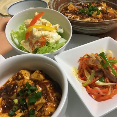 麻婆豆腐、人参炒め、レタスと玉子サラダ。
