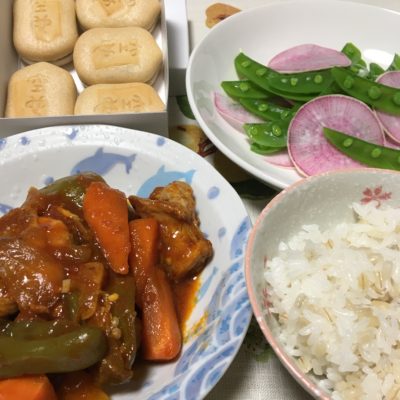 チキンカチャトーラ、紅芯大根とインゲンのサラダ、空也の最中。