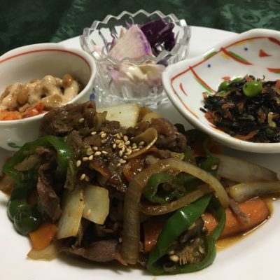 牛肉のニンニク炒め、ひじき煮、紫大根のマヨサラダ、キムチ納豆。