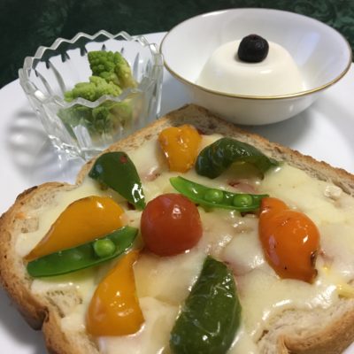 ライ麦パンのピザトースト、ロマネスコ、パンナコッタに冷凍ブルーベリー。