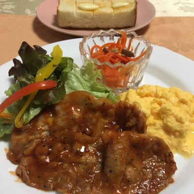 ポークチャップ、スクランブルエッグ、キャロットラペ、レタスとパプリカのサラダ。