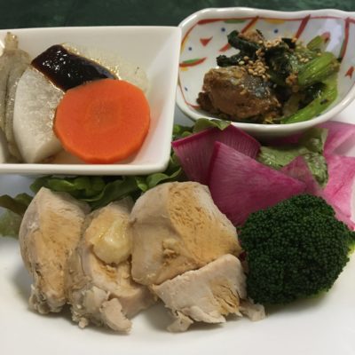 蒸し鶏のワサビ添え、紫大根とレタスのサラダにブロッコリー、おでん、鯖と小松菜炒め。