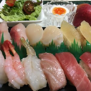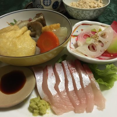 鰤のお刺身とレタス、蓮根と紅大根のピクルス、おでん。