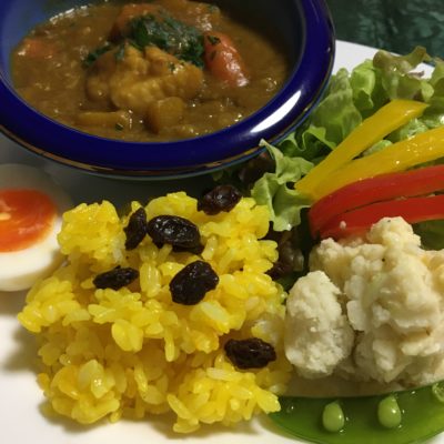 チキンカリー、ターメリックライスと塩玉子、レタスとパプリカにポテトサラダとインゲン。