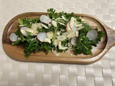 サーモンのお刺身、ブロッコリー、レタスのサラダ、キムチ納豆、いちご。
