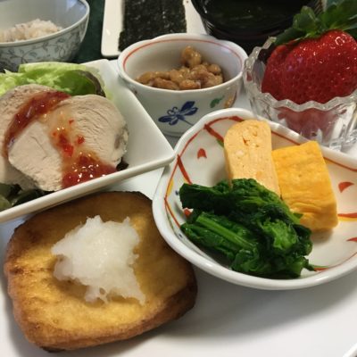 焼お揚げと大根おろし、玉子焼きと菜花のお浸し、チキンのスイートチリソースがけ、納豆。