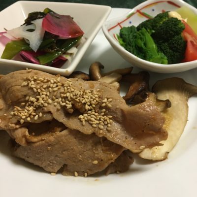 豚モモ生姜焼き、焼野菜、菜花のお浸しにブロッコリーとトマト、蓮根と紫大根に若芽の酢の物。