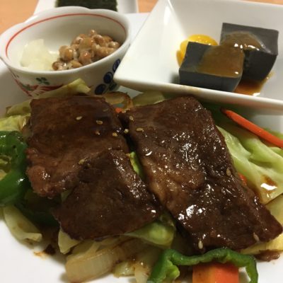 焼肉、野菜炒め、胡麻豆腐、おろし納豆。