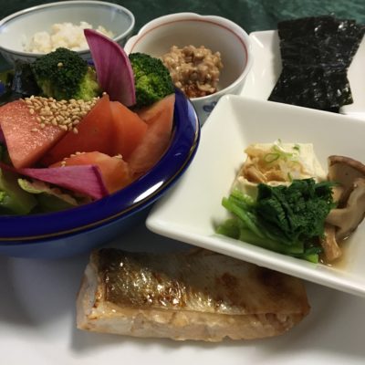 桜鱒のオリーブソテー、温奴と菜花のお浸し、サラダ、胡麻納豆。