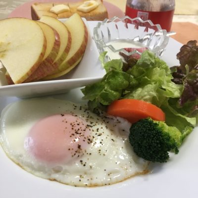 目玉焼き、レタスとブロッコリーに人参煮、ヨーグルトと冷凍いちご、りんご。