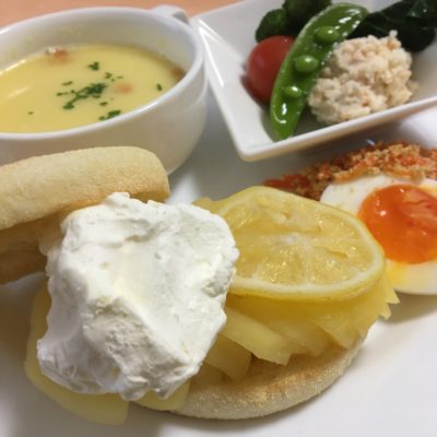 イングリッシュマフィンのりんごサンド、人参の子和えと塩玉子、ポテトサラダにブロッコリーとエンドウ、プチトマト、コーンポタージュ。