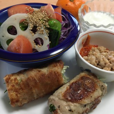 豚モモの水菜巻、蓮根とワカメのサラダ、キムチ納豆、ヨーグルト、みかん。